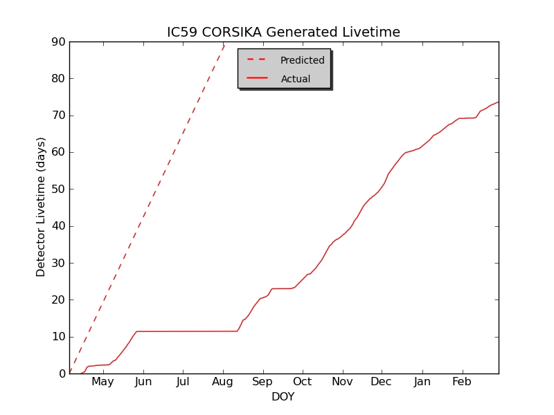 Detector Performance – During the period 1 October 2010 through 12 May 2011 the 79-string detector configuration (IC79) operated in standard physics mode 93% of the time. Standard physics operation was attained 97% of the time during the 86-string configuration from 13 May 2011 through 31 July 2011. Figure 1 shows the cumulative detector time usage over the reporting period, ending 31 July 2011. The trend of increasingly good performance and continual operations continued through the austral summer construction and maintenance season. Seven new strings and eight IceTop stations were commissioned. The initial in-ice verification, calibration, and geometry of the full detector were completed in a mere 66.2 hours of detector time. Data from various verification tools (e.g., dust loggers, in-ice cameras, etc.) to study details of the ice properties used 31.6 hours of detector time. All 52 detector control and processing compute nodes were replaced on the South Pole System (SPS) resulting in a loss of merely 1.5 hours of detector uptime. Unexpected downtime due to routine hardware failures was 0.5%.