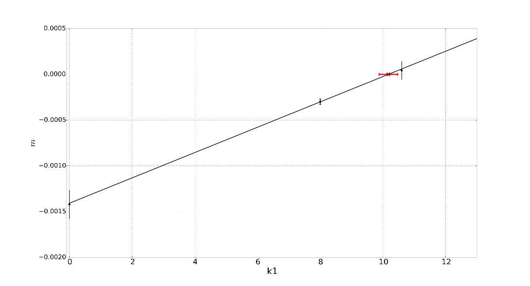 Fig 2: The slopes, m, of the change in amplitude of w=2 Fourier mode versus track-to-DOM distance (y-axis), as a function of each simulated anisotropy, k1 (x-axis). The slopes are linearly dependent on the simulation anisotropy strength, with an intercept at 0 achieved for an anisotropy of approximately 10.2%, which is indicated by the red cross.