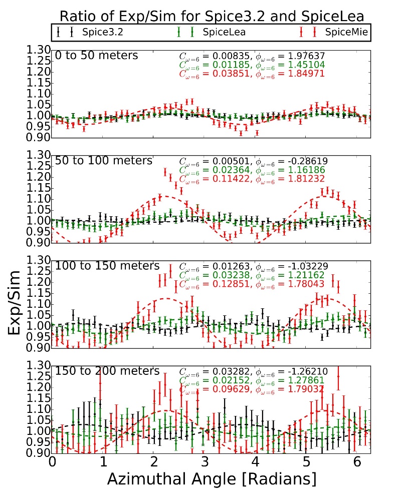 Fig 1: The ratio of the observed charge as a function of azimuth normalized to the average observed charge from atmospheric muons between data and simulation. The red, green and black data points correspond to simulation with 0, 8, and 10.6% anisotropy strength, respectively. The lines are drawn using the amplitude and phase determined by decomposing these ratios into Fourier space, and picking out the w = 2 component corresponding to the anisotropy.