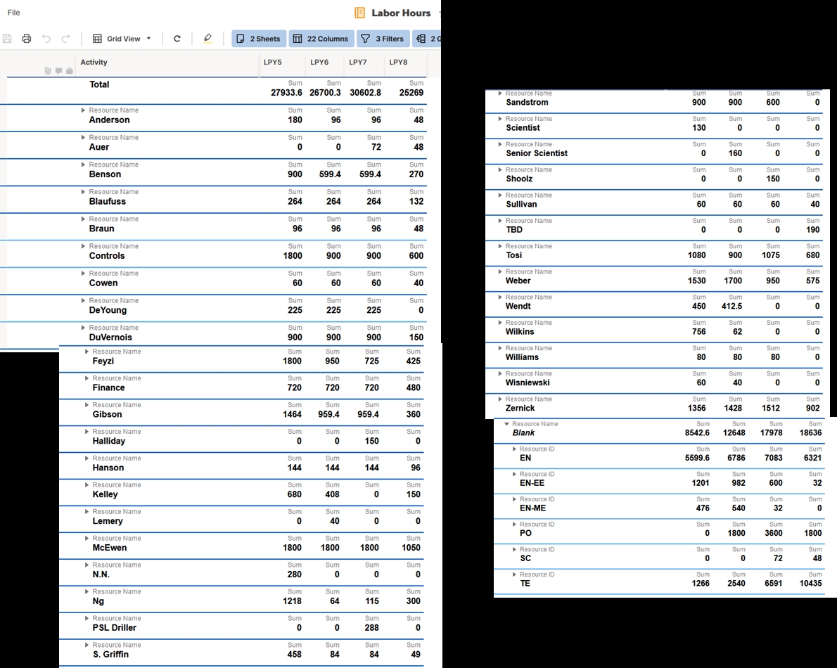 Additionally, we have looked at resource usage by named person (where available) or category of people. Below is the report from SmartSheets grouped by resource name/type.