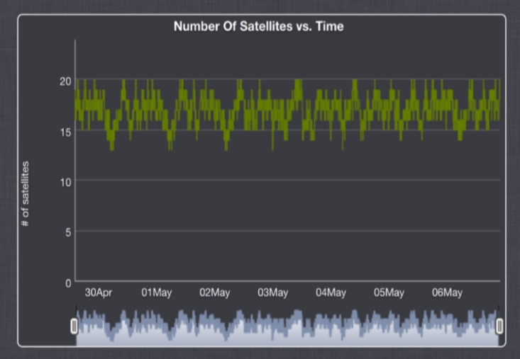 The typical number of satellites (GPS and GLONASS) in view at Pole is 15-20 after altitude masking (see Figure below). The Upgrade will use the existing IceCube GPS (Spectracom SecureSync) as the master clock. This clock contains an oven-compensated crystal oscillator which will continue to operate undisciplined if GNSS signal integrity is compromised, albeit with increasing drift (typ df/f ~ 10-10 over 1 day). This does not affect the relative timing between modules and thus would not compromise the observatory operation except for extremely long outages of order months.