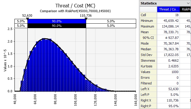 An example of a distribution for cost exposure is given below for “ORG2” [70000, 45000, 145000] [Major injury occurs during drill season, but not associated with drilling. Work stoppage occurs until review is performed and "safe to proceed" determined.]