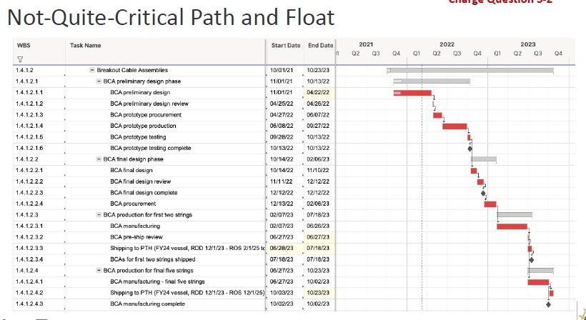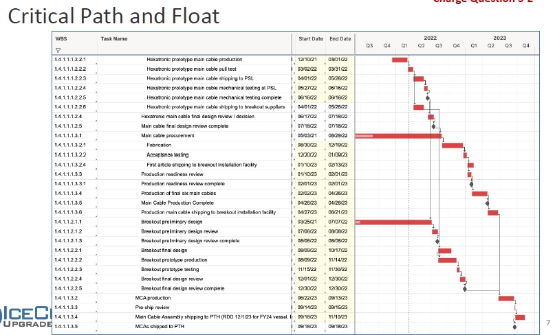 The critical path of getting pieces together to ship is shown below for 1.3 / 1.4 from the smart sheet schedule. The area we are watching carefully as it lies on the critical path is the drill control system (we just had a review of this a couple of weeks ago). The next item on the critical path is the main cable assemblies (here we have ~1 year of float before they must be shipped, however we were hoping to ship them in 2023). Finally, the mDOMs, while they currently have more than a year of float, because of problems procuring the parts for the main board we are looking at a redesign.