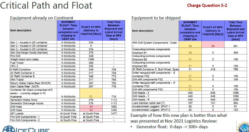 Top schedule risks: winter storage failure could cause a year delay in worst cases. Similarly on-ice accidents have worst case schedule impacts of a full year. Critical drill system failures, or personnel casualties, during the FS3 can have impacts which exceed our project specifications or boundaries. That is, a risk which would have to be carried by the NSF.